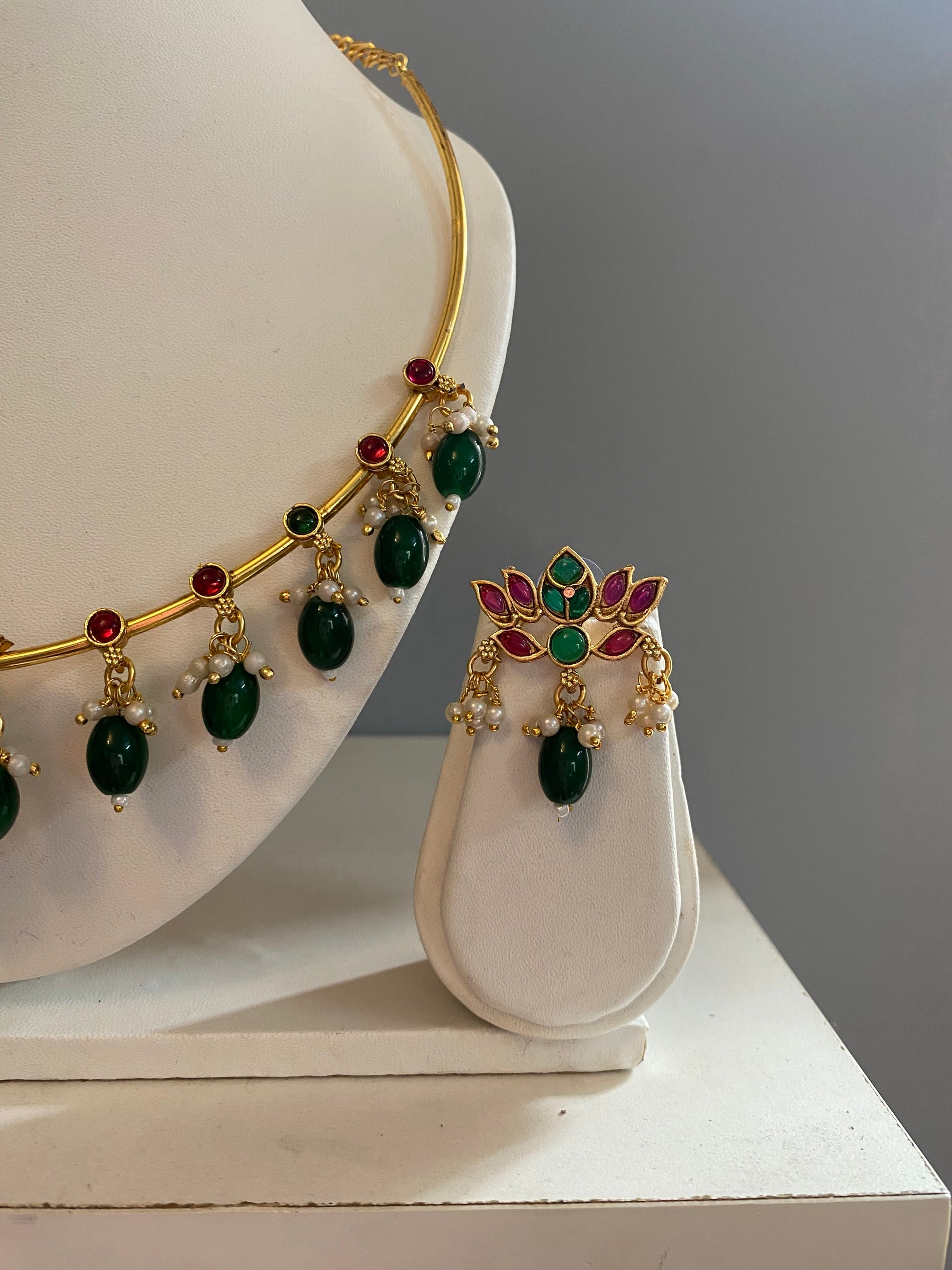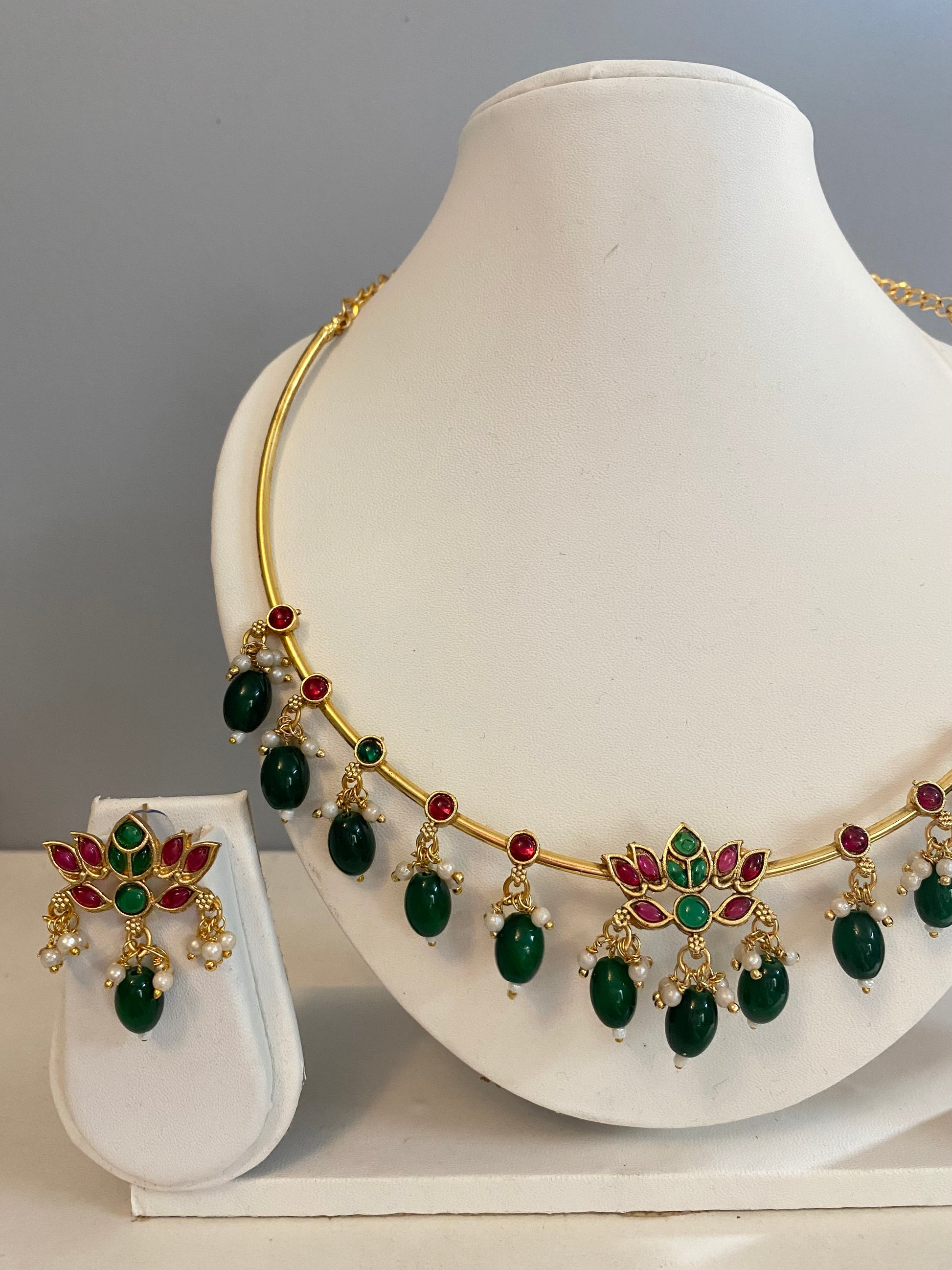 Beautiful green beads droplets jewellery set with lotus pendant. Has pair of matching earrings